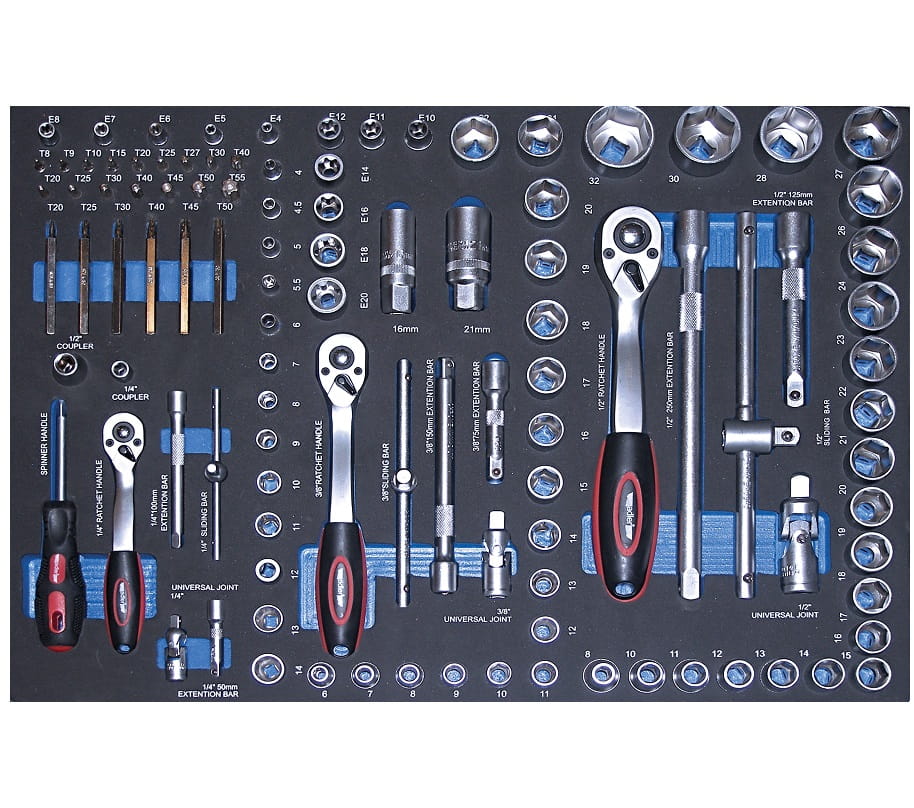- Zestaw nasadek Torx wewnętrzny: E4, E5, E6, E7, E8 - Zestaw 31 szt. kluczy nasadowych z chwytem 3/8”: