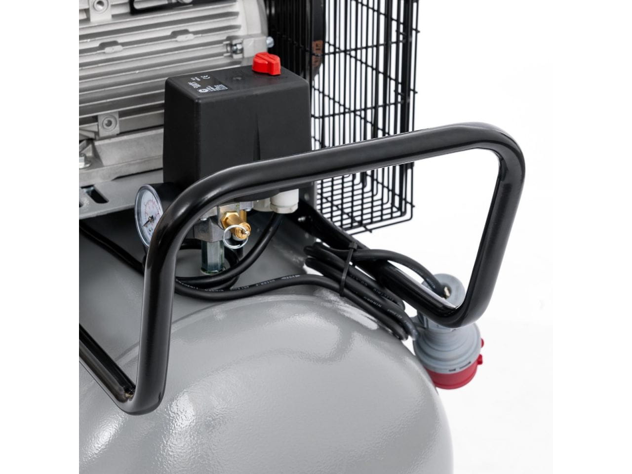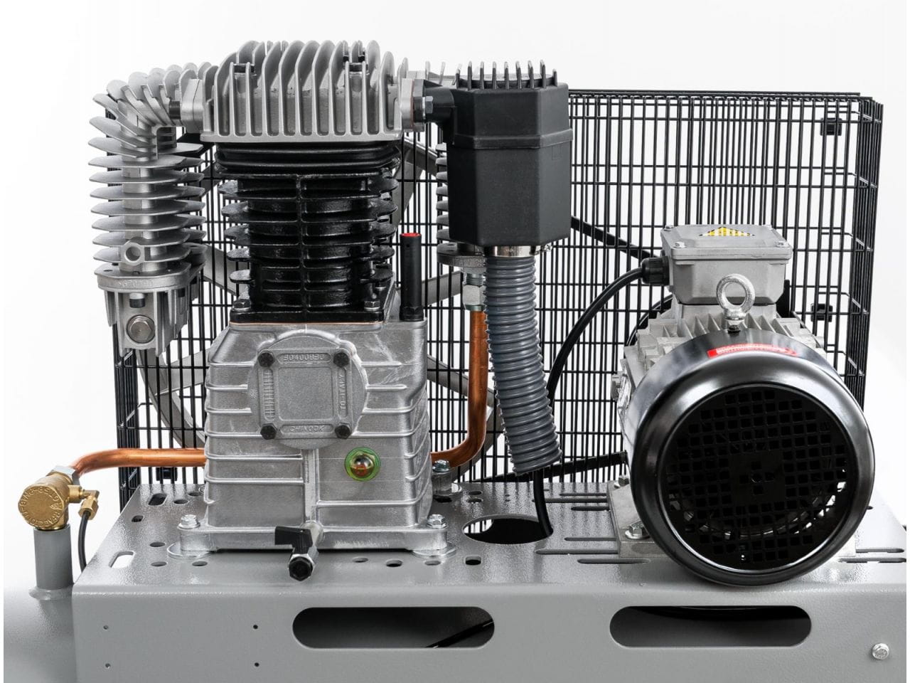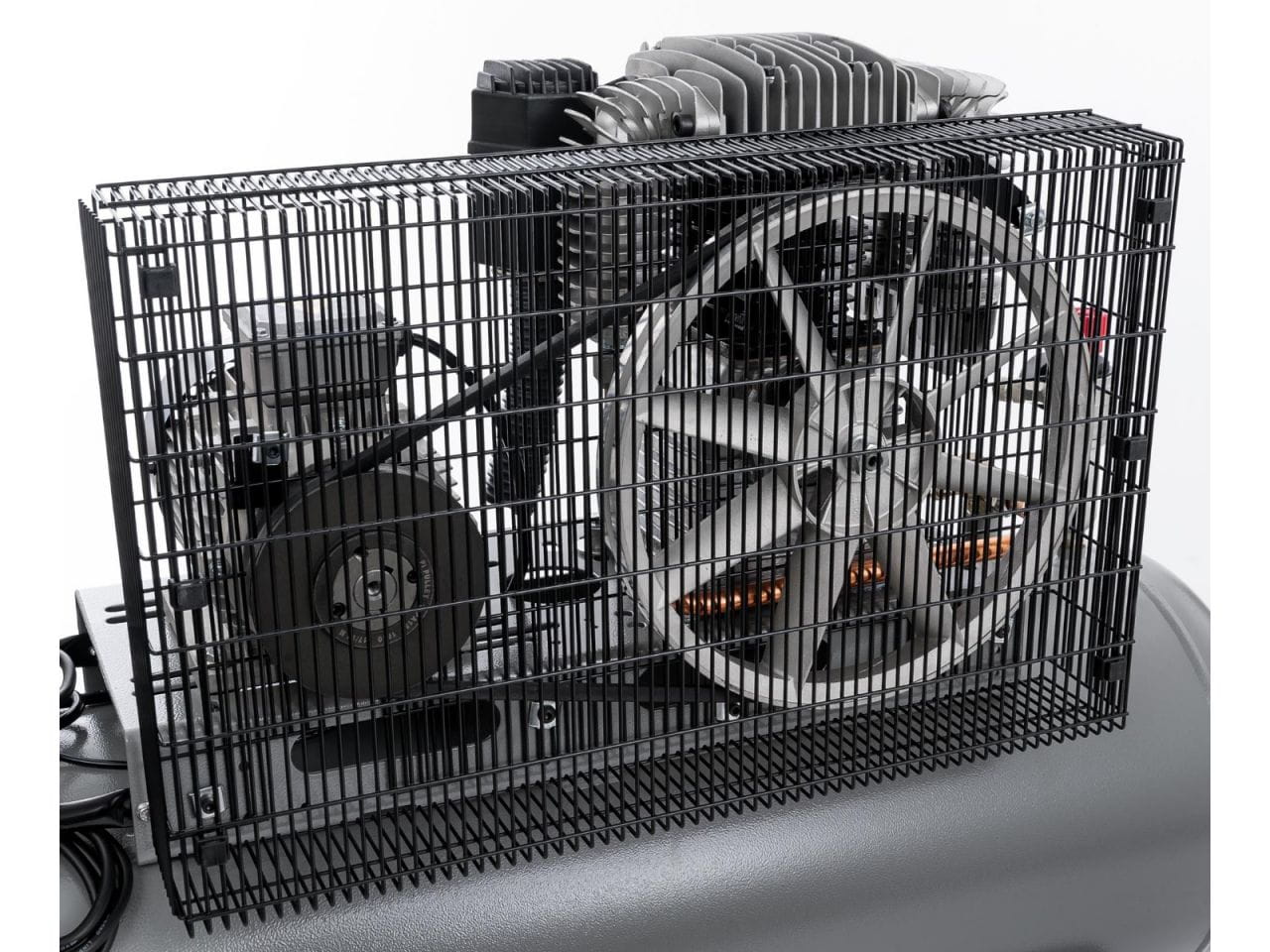 - Kompresor posiada żebra chłodzące i koło zamachowe, dzięki czemu sprężone powietrze jest zimniejsze, a powietrze jest lepiej sprężane w zbiorniku ciśnieniowym.
