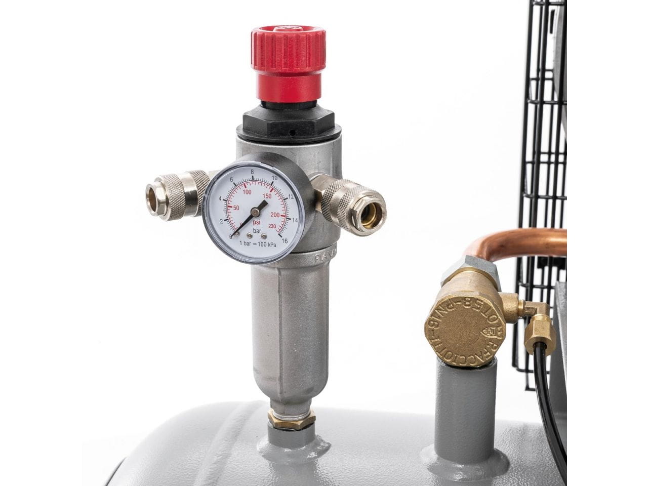 Sprężarka wyposażona jest w dwa manometry. Manometr na uchwycie i przełącznik ciśnienia wskazują ciśnienie w kotle, manometr na czerwonym pokrętle, który jest zamontowany na regulatorze, pokazuje ustawione ciśnienie. Sprężarka działa na przepływie mocy. - Ta sprężarka jest idealnym rozwiązaniem do profesjonalnej pracy.