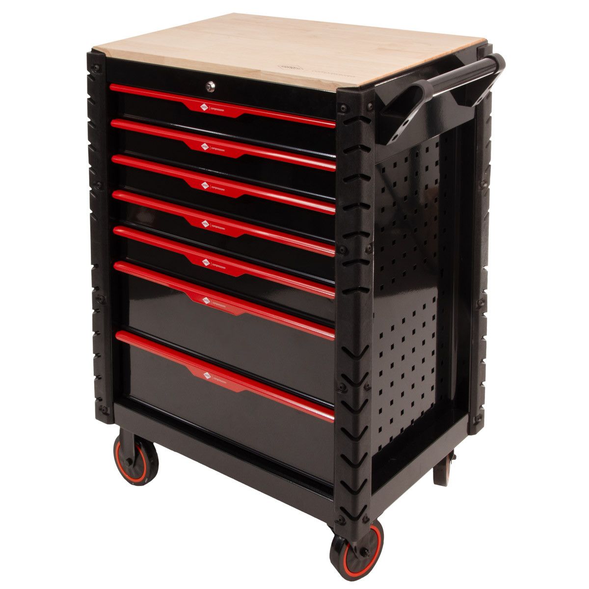 - Wózek narzędziowy 79169 został wyposażony w solidny blat z wysokiej jakości drewna, który zwiększa jego trwałość i wytrzymałość.
