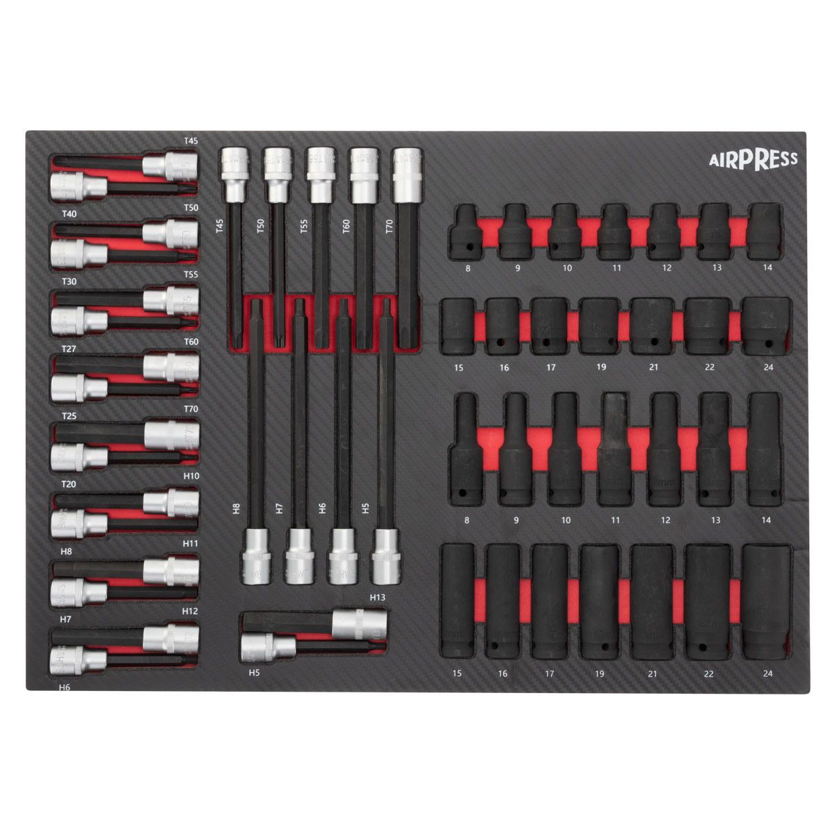 - 27 bitów z nasadką 1/2" - 100L*H5-6-7-8-T20-T25-T27-T30-T40-T45-T50-H10-T55-H11-H12-T60-H113-T70; 140L*T45-T50-T55-T60-T70; 200L*H5-6-7-8