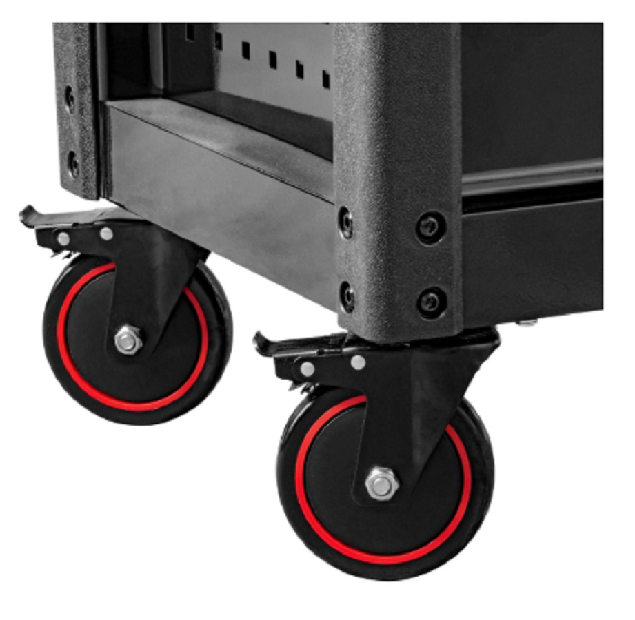 - Dwa koła z hamulcami gwarantują pełną stabilność podczas pracy, dzięki czemu wózek może służyć zarówno jako mobilna stacja narzędziowa, jak i stabilne miejsce przechowywania sprzętu.
