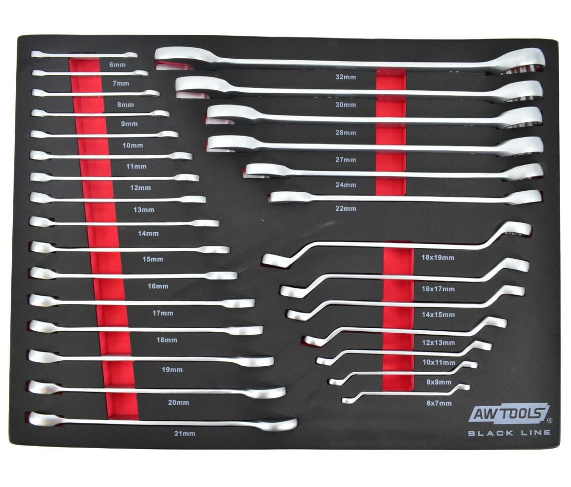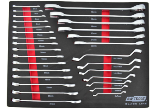 - 22szt. klucze płasko-oczkowe : 6, 7, 8, 9, 10, 11, 12, 13, 14, 15, 16, 17, 18, 19, 20, 21 ,22, 24, 27, 28, 30, 32 mm