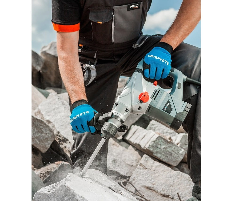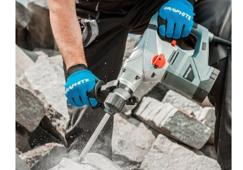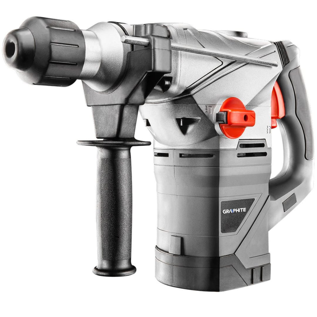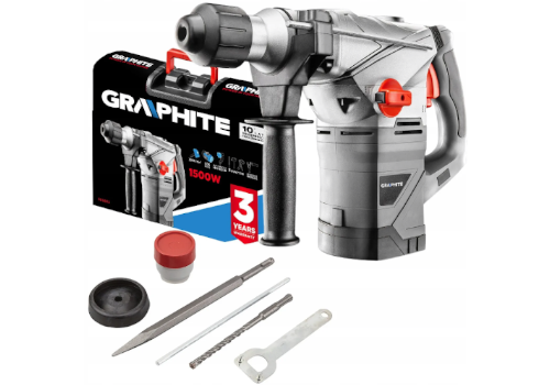 Specjalistyczny 3-funkcyjny młot udarowy SDS+ GRAPHITE (nr ref. 58G862) o mocy 1500W, niezastąpiony podczas prac instalacyjnych i rozbiórkowych.