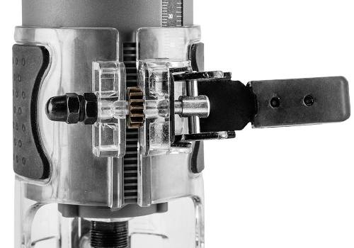 Przezroczysta płyta podstawy frezarki krawędziowej pozwala na dobrą widoczności frezu i materiału.