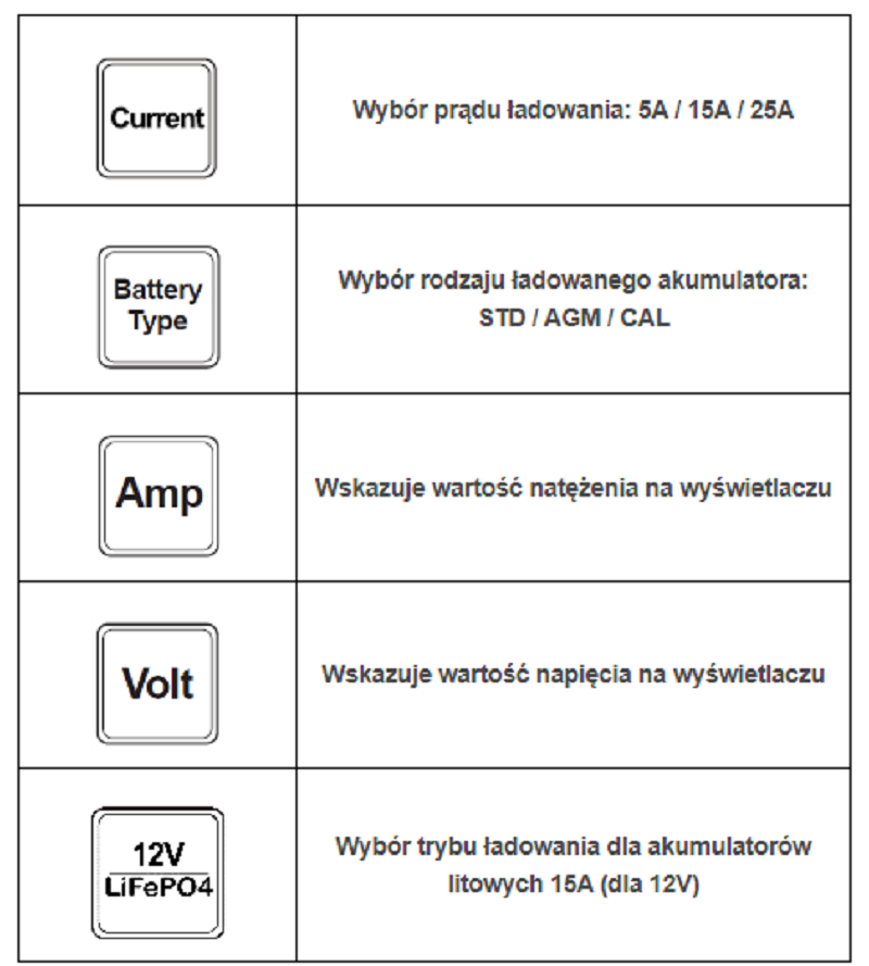- Prąd ładowania: 5/25A (12V) / 15A (12V LiFePO4) / 12.5A (24V)