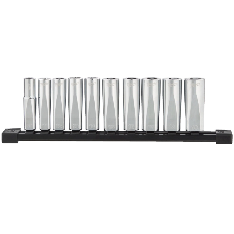 Milwaukee 3/8" Drive Metric Deep Chrome Sockets - Zestaw nasadek metrycznych długich 3/8″ - 10 szt.