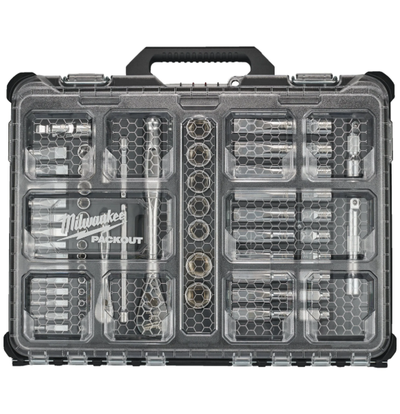 Milwaukee Packout 1/4" + 1/2" 63 pc Ratchet/Socket Set - Zestaw nasadek metrycznych 1/4” i 1/2” z grzechotką w organizerze PACKOUT - 63 szt.