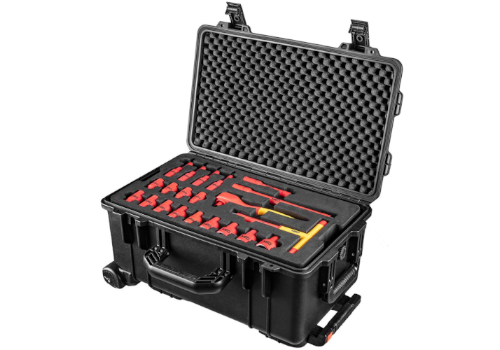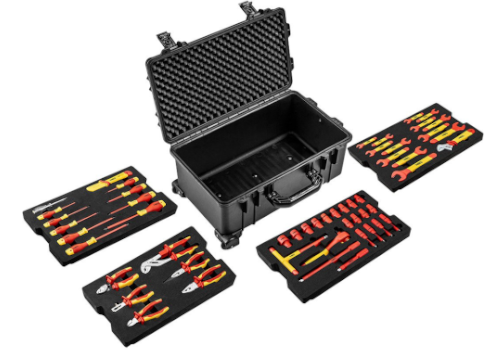 - Wyposażona w 4 piankowe wkłady zawierające narzędzia certyfikowane atestem 1000V wg standardu IEC60900.