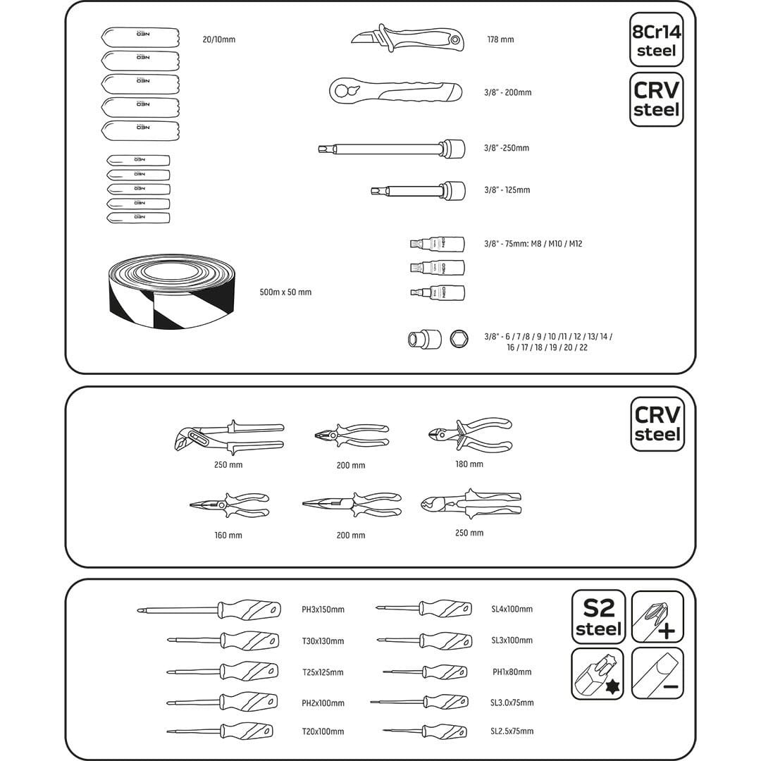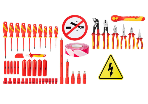 - Zestaw składa się m.in. na szczypce, wkrętaki, samozaciskowe nasadki kablowe, znaki ostrzegawcze, taśmę, nasadki, klucz grzechotkowy czy przedłużki.