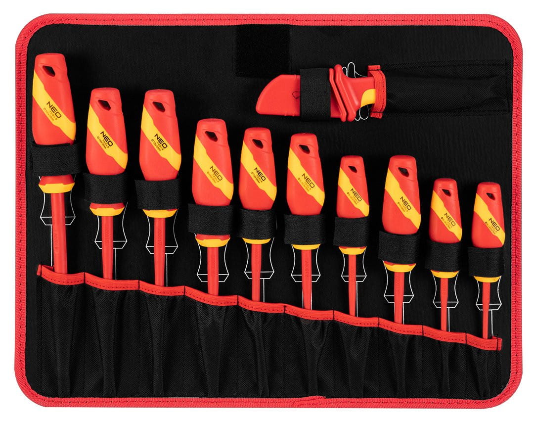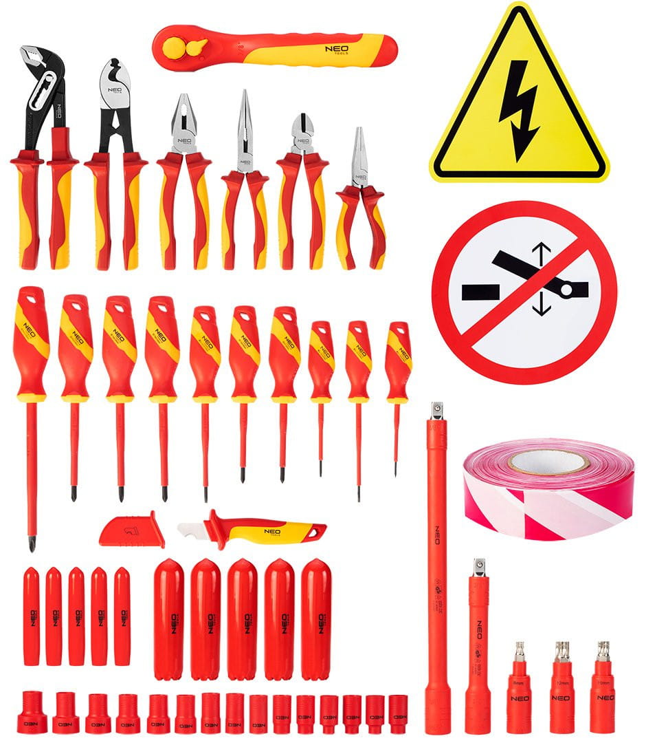 - Kompleksowy zestaw izolowanych narzędzi do naprawy samochodów elektrycznych i hybrydowych od marki NEO, składający się na 51 elementów wysokiej jakości.