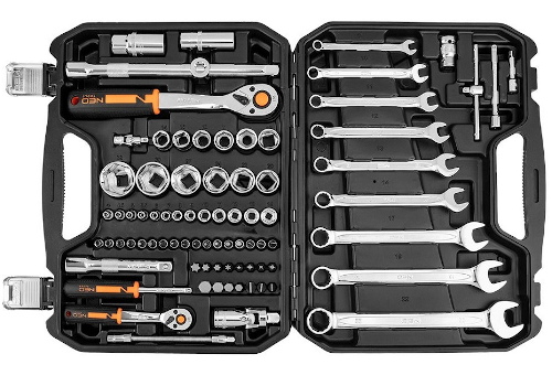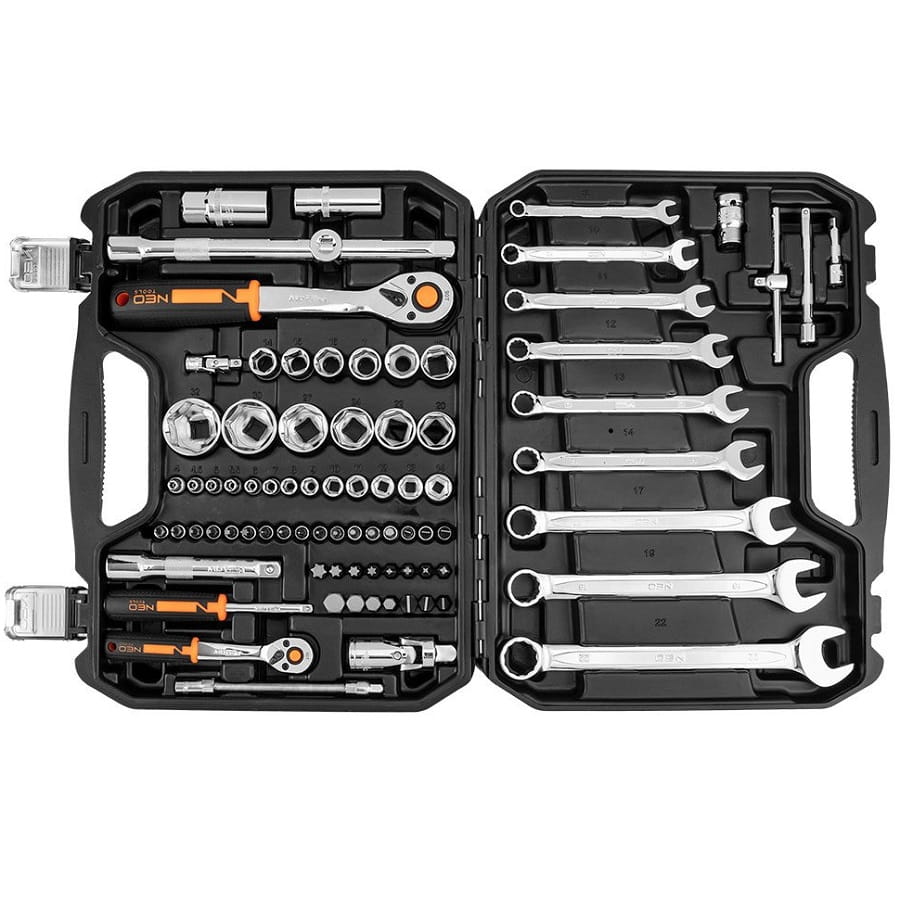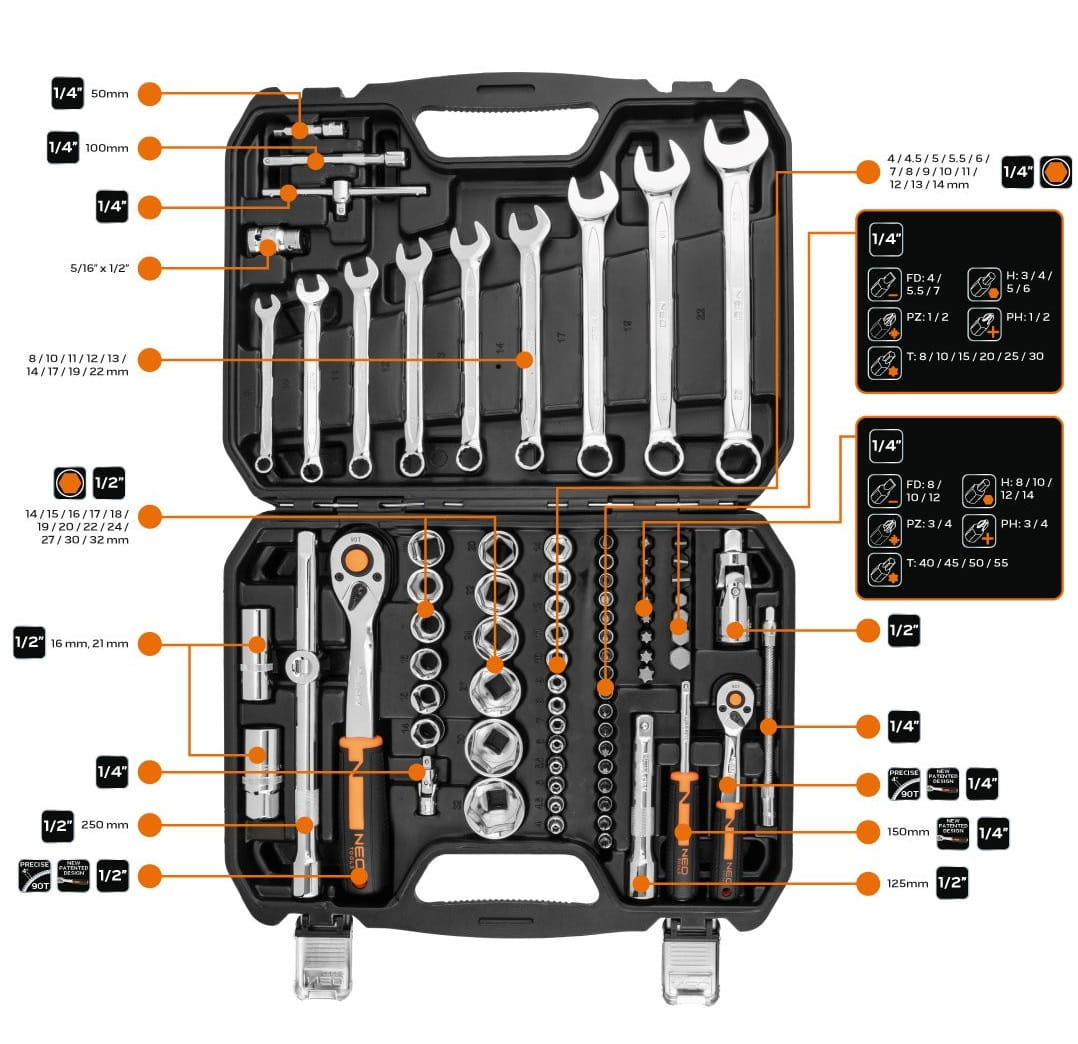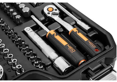 - Zestaw kluczy nasadowych 1/2" i 1/4" NEO (nr ref. 10-059) składa się z 82 elementów, wykonanych z wysokiej jakości stali chromowo-wanadowej.
