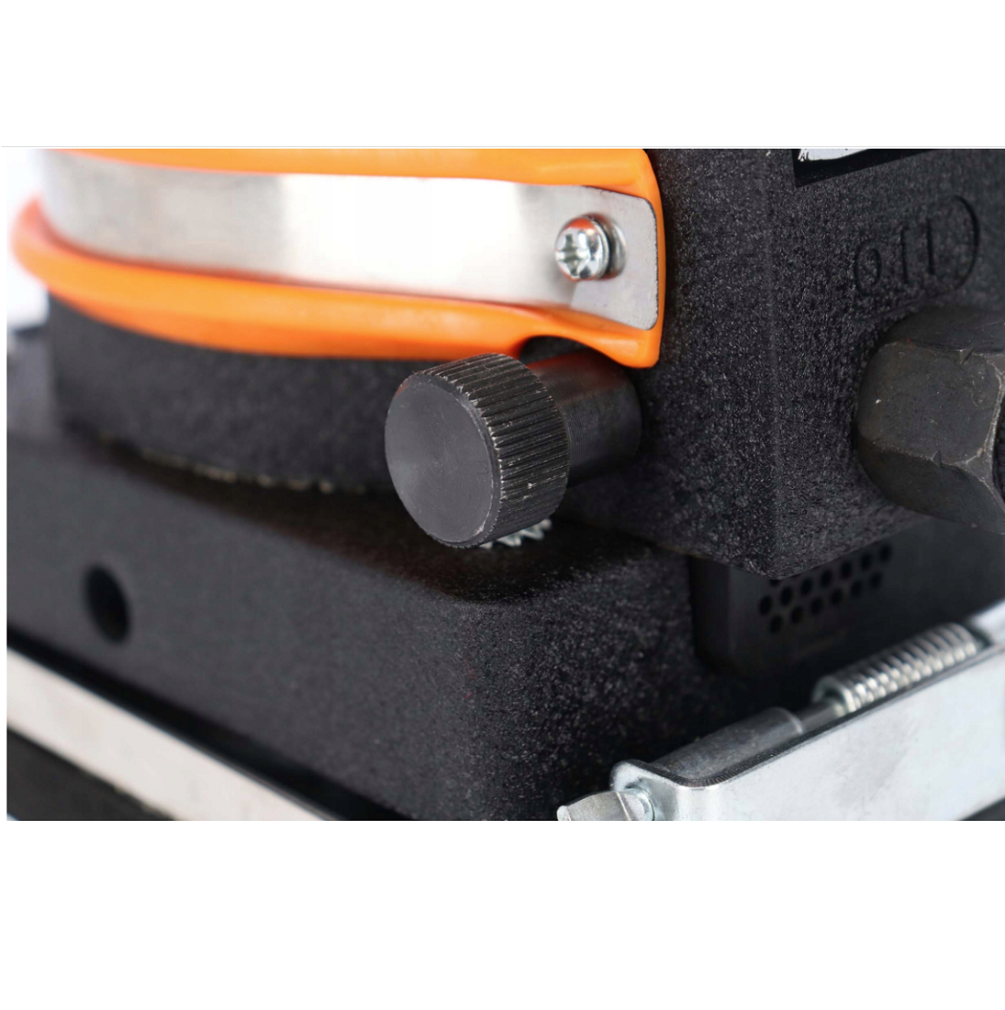 • Metalowe zaciski umożliwiające stosowanie papieru ściernego ciętego z rolki.