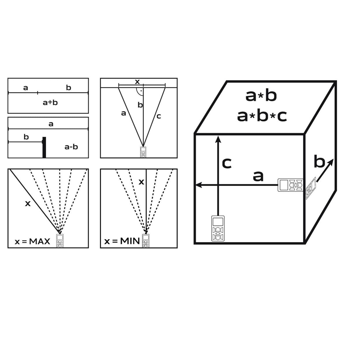 Z jego pomocą można przeprowadzić pomiar odległości, pola powierzchni, objętości, pomiary pojedyncze i ciągłe, Pitagorasa, dodawanie i odejmowanie, pomiar maksymalny oraz minimalny.