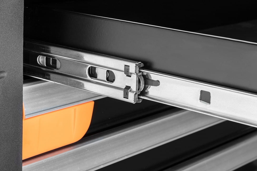 - Szafka posiada 7 praktycznych szuflad na narzędzia, zamykanych za pomocą zamka centralnego.