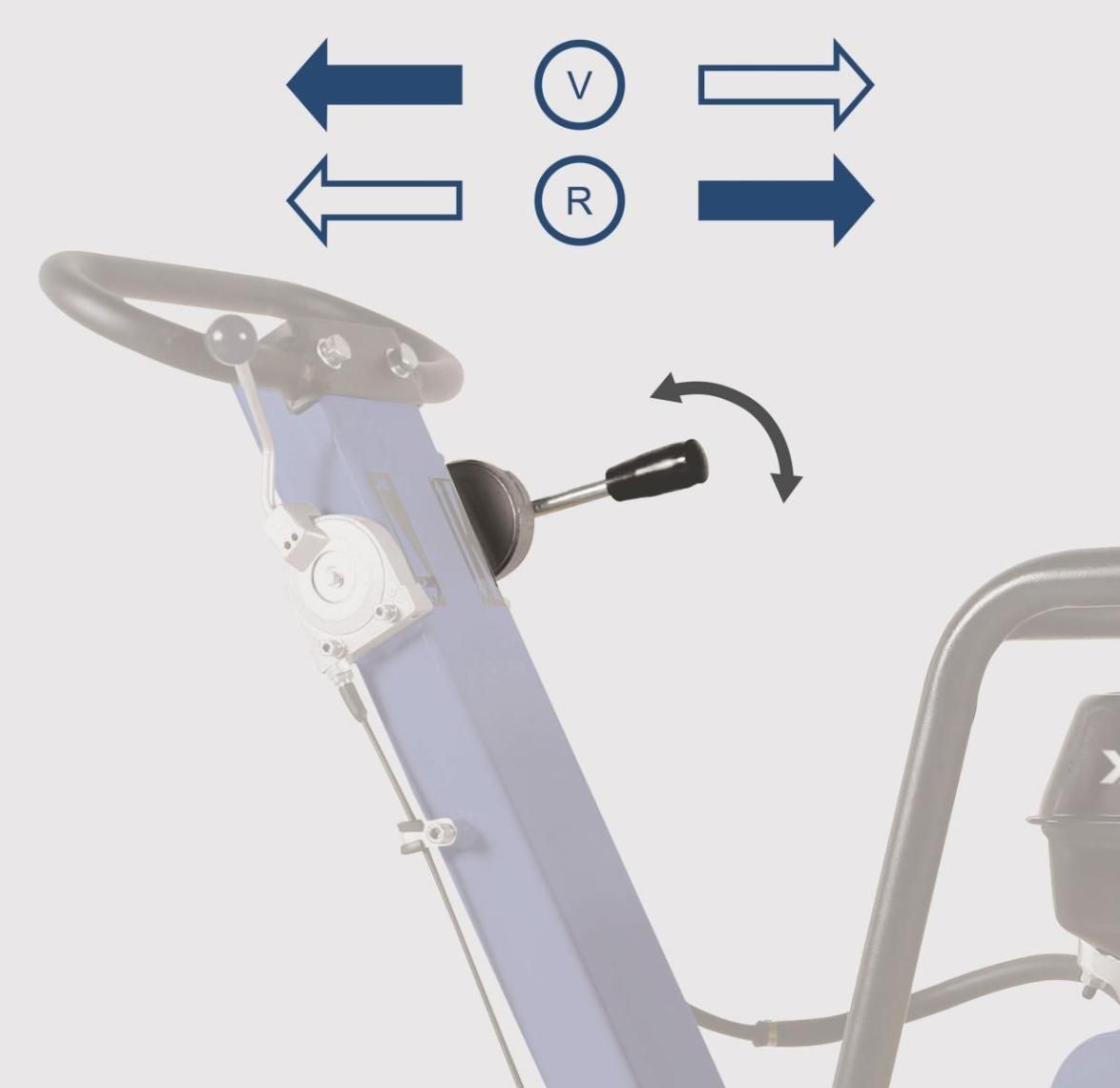 - Rewersyjna Funkcja: Zagęszczarka może poruszać się zarówno do przodu, jak i do tyłu, co ułatwia manewrowanie na ograniczonej przestrzeni. Przełączanie kierunku jest proste dzięki dźwigni umieszczonej na uchwycie.