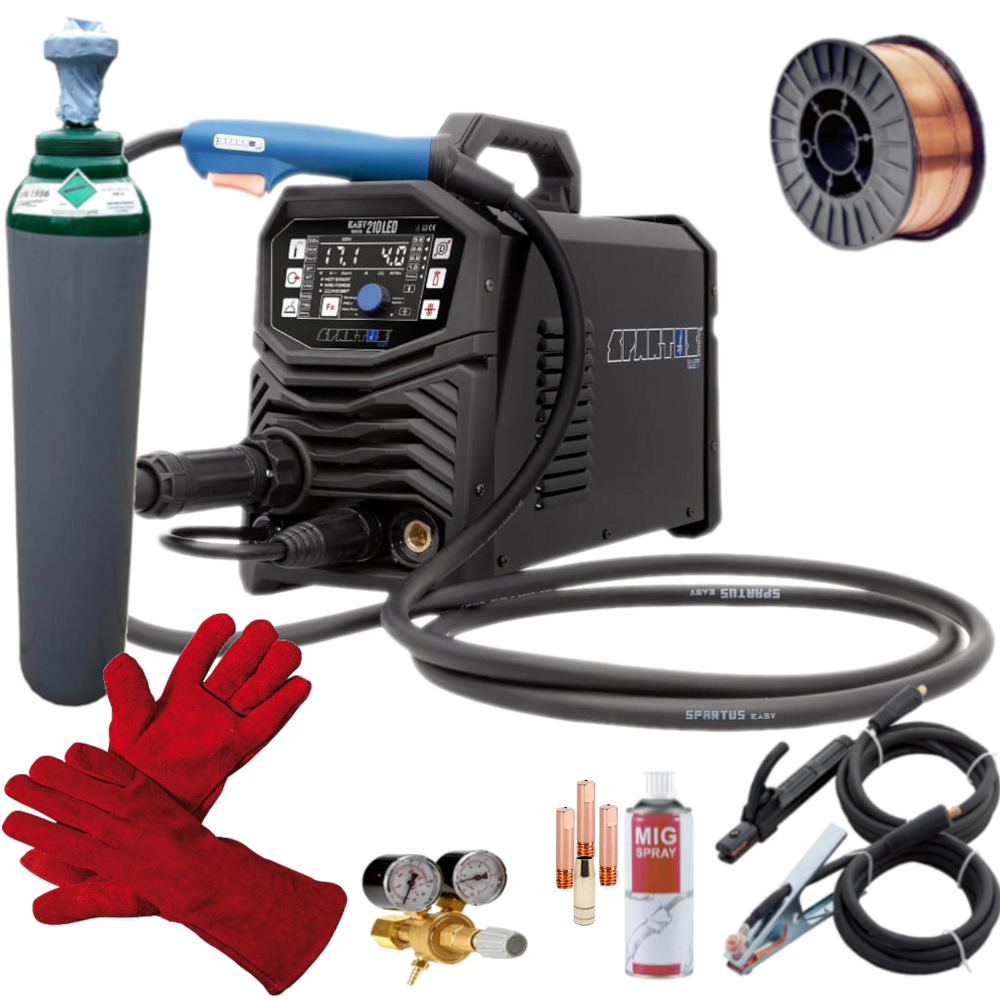 Spartus EasyMIG 210LED - Spawarka + Pełna butla do spawania CO2 8L + Reduktor CO2/Ar + Drut do stali 0.8mm 5 kg + Rękawice spawalnicze + MIG spray + 3x Końcówka prądowa do stali + Dysza gazowa