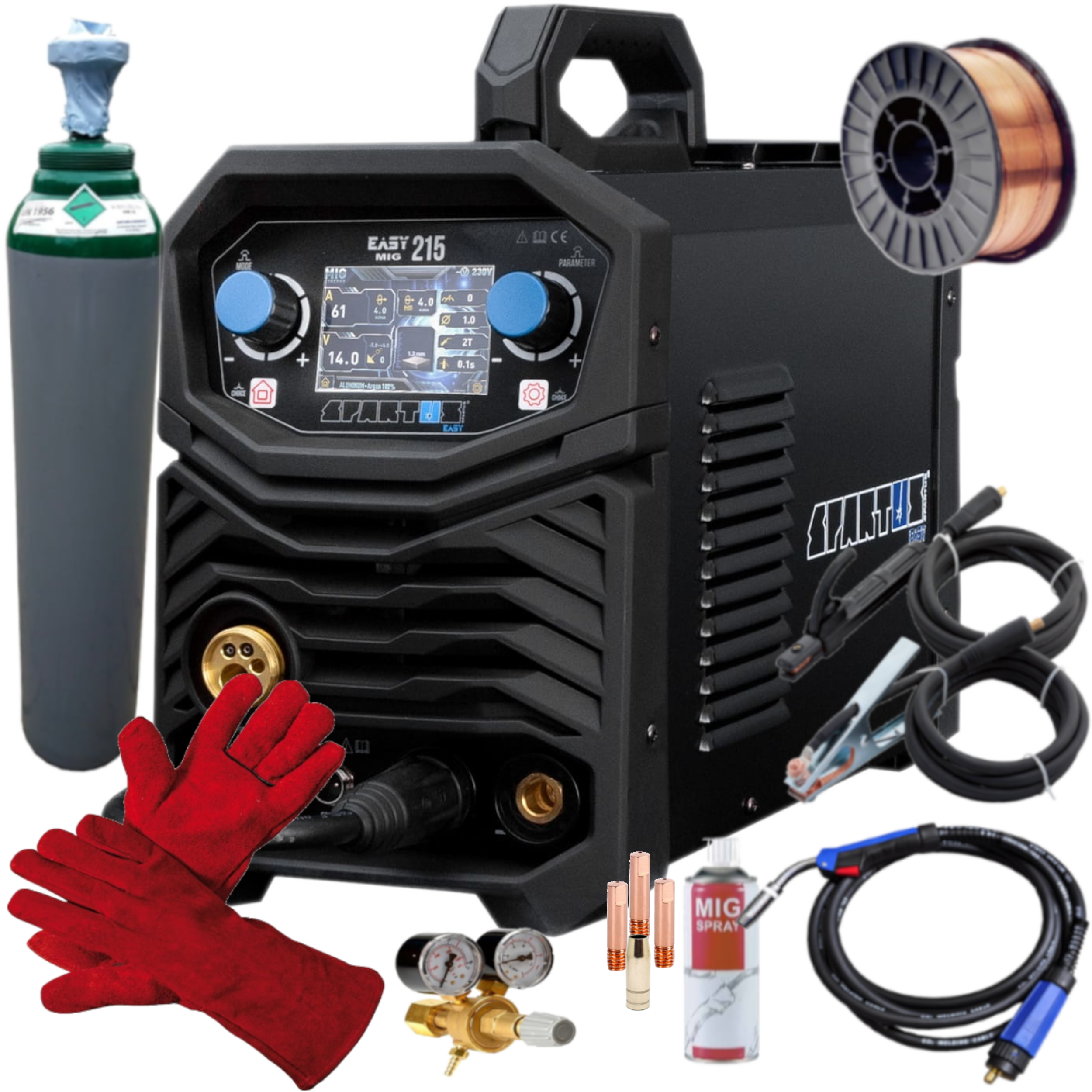 Spartus EasyMIG 215 - Spawarka + Pełna butla do spawania CO2 8L + Reduktor CO2/Ar + Drut do stali 0.8mm 5 kg + Rękawice spawalnicze + MIG spray + 3x Końcówka prądowa do stali + Dysza gazowa