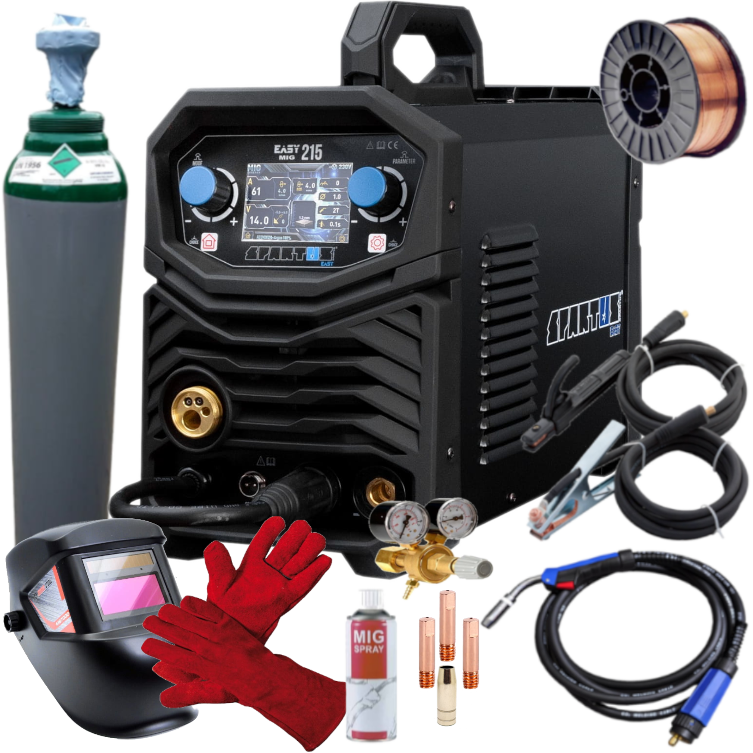 Spartus EasyMIG 215 - Spawarka + przyłbica samosciemniajaca + reduktor CO2 AR + drut do stali 0.8 mm 5kg + rekawice spawalnicze + Pełna butla do spawania CO2 8L + Preparat ochrony MIG spray + 3 końcówki prądowe + dysza