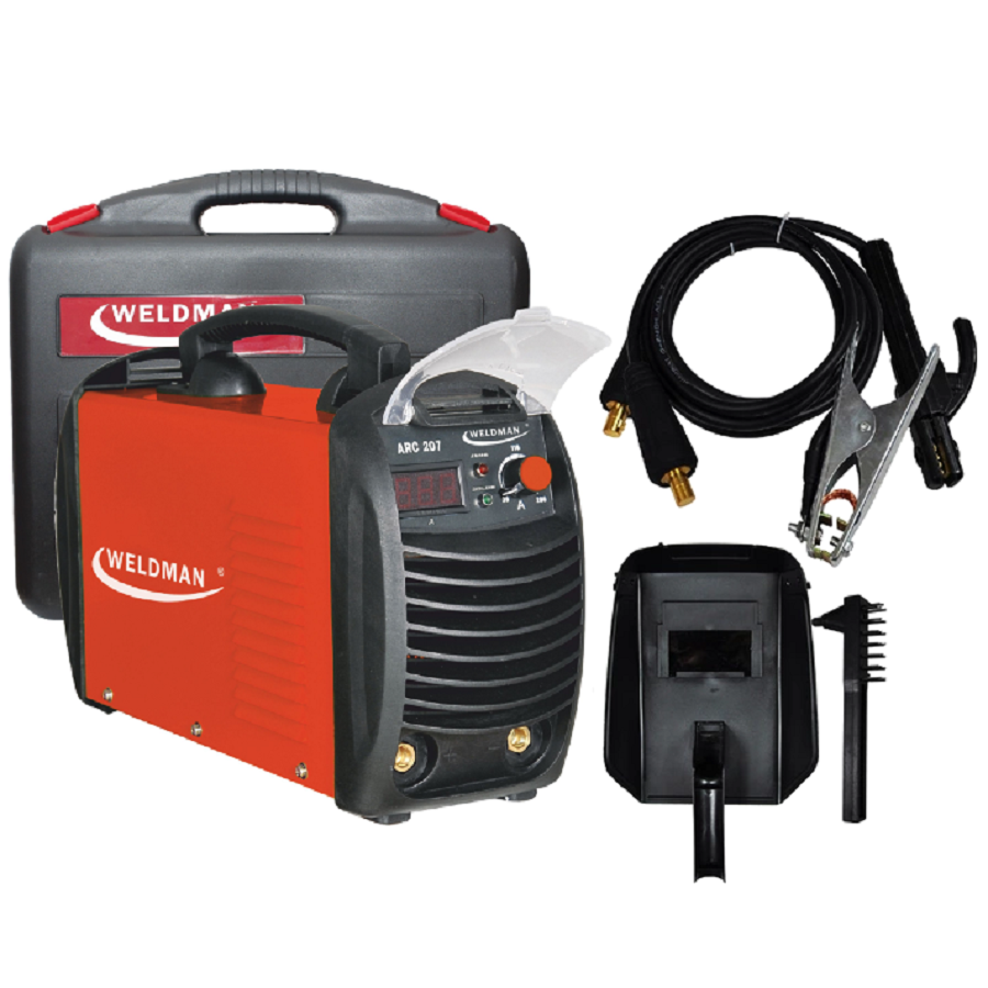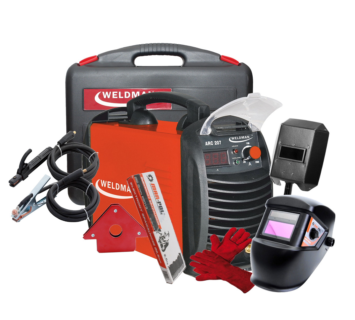 WELDMAN ARC 207 walizka PCV - Spawarka inwertorowa + przyłbica samościemniająca + rękawice spawalnicze + kątownik magnetyczny + Elektrody rutylowe - łatwospawalne