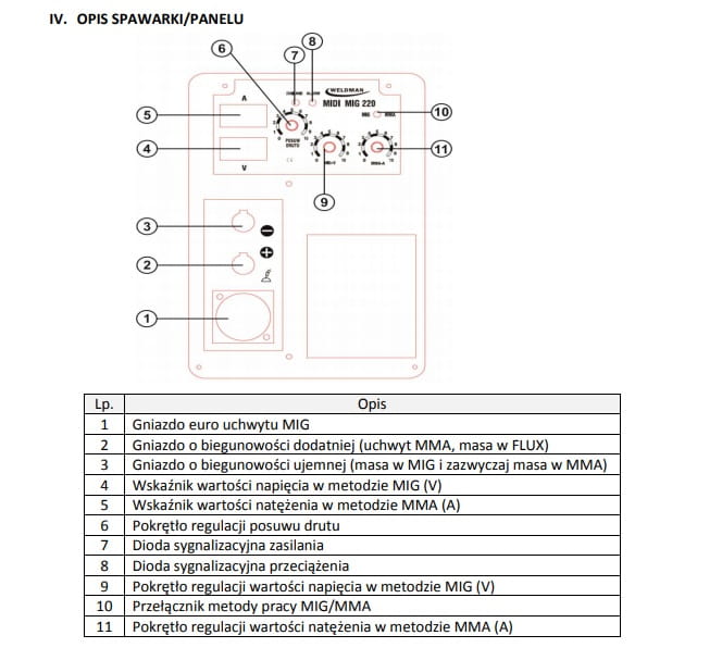 - Pokrętło regulacji wartości napięcia w metodzie MIG (V)