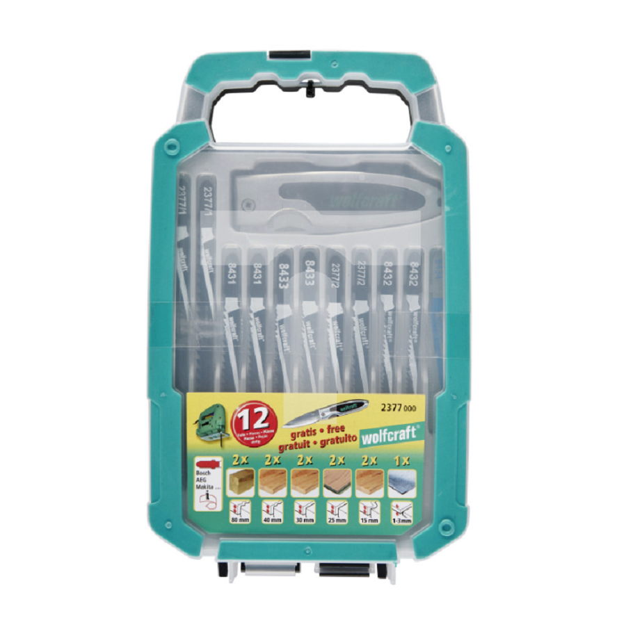 W zestawie: - 3 x brzeszczoty HCS - cięcie zgrubne do drewna do 60 mm - 3 x brzeszczoty HCS - cięcie zgrubne do tworzyw sztucznych i drewna do 60 mm - 2 x brzeszczoty HCS - cięcie dokładne do tworzyw sztucznych i drewna do 20 mm (w tym po krzywych) - 2 x brzeszczoty HCS - cięcie czyste do tworzyw sztucznych i drewna do 30 mm - 1 x brzeszczot HSS - żelazo, metale kolorowe 3- 10 mm - 1 x brzeszczot HSS - żelazo, metale cienkie żelazne 1,5 - 4 mm - nóż kieszonkowy