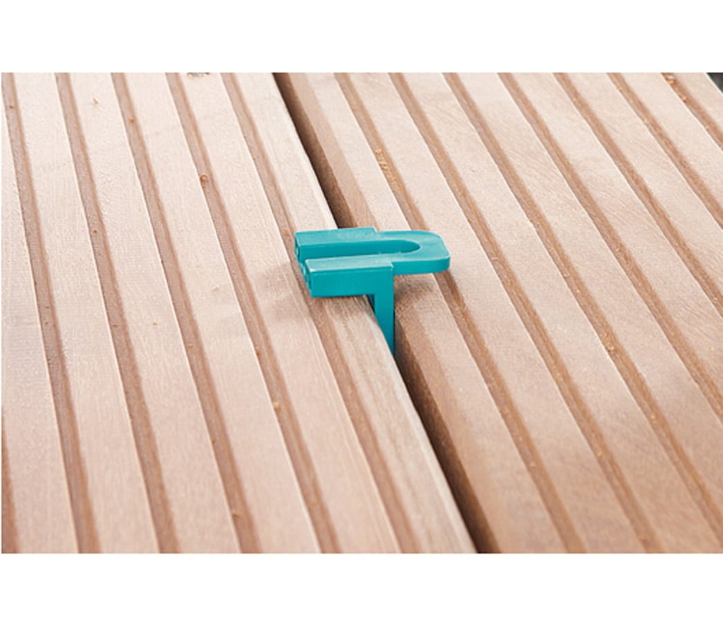 - Solidne adaptery dystansujące do desek tarasowych pozwalają uzyskać dokładną szerokość szczelin 6 lub 8 mm.